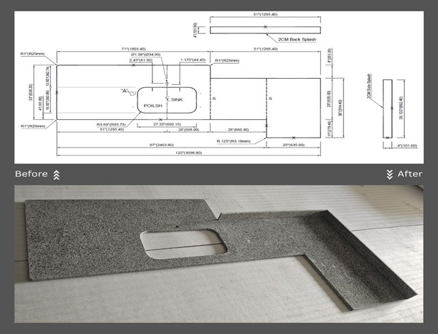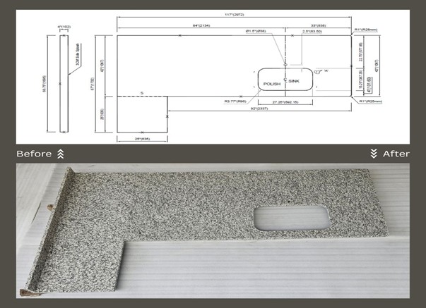 2. Template Production: i.e., a strong material is used to manufacture a perfect copy of the countertop surface, which includes sink locations, cutouts, and edge profiles.